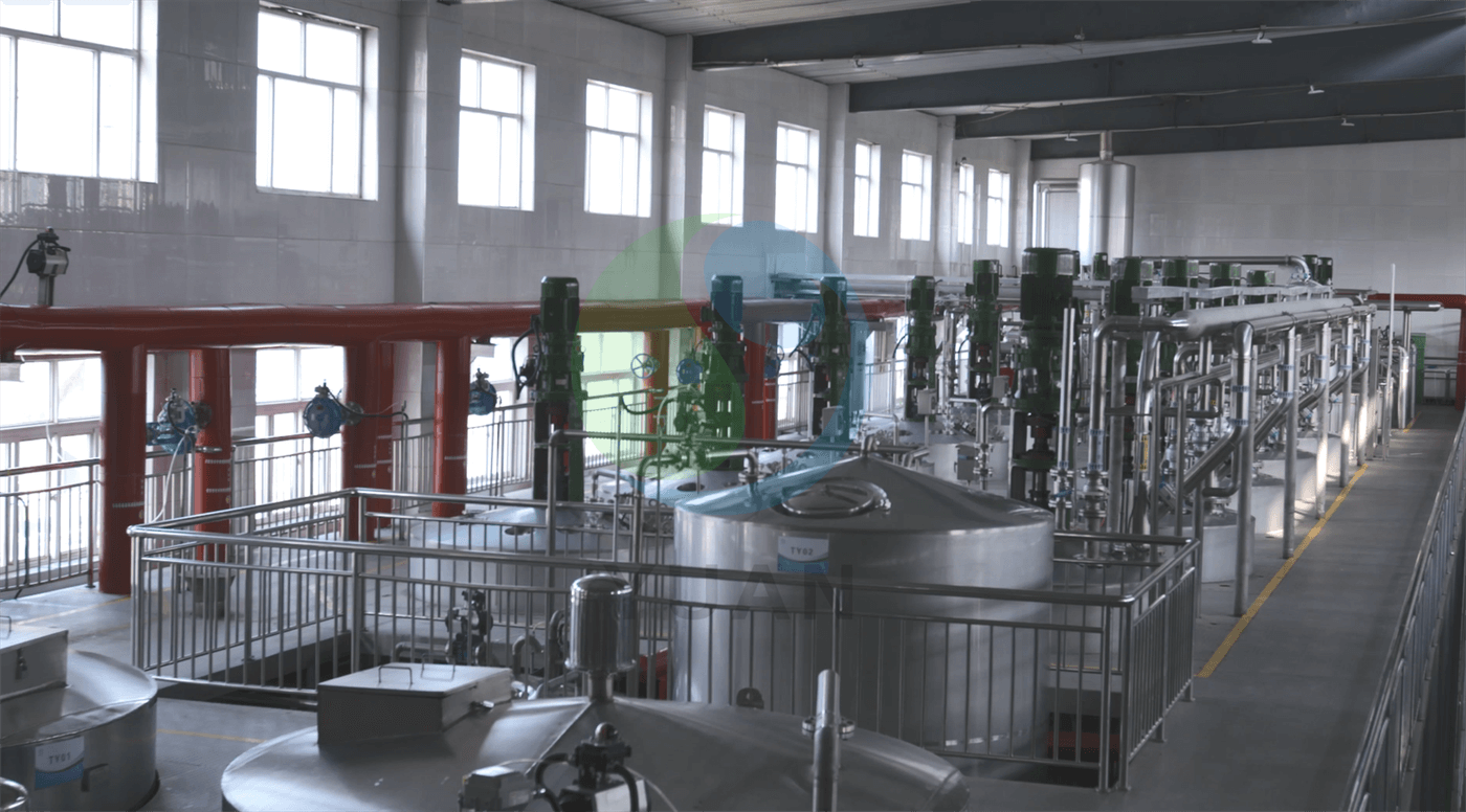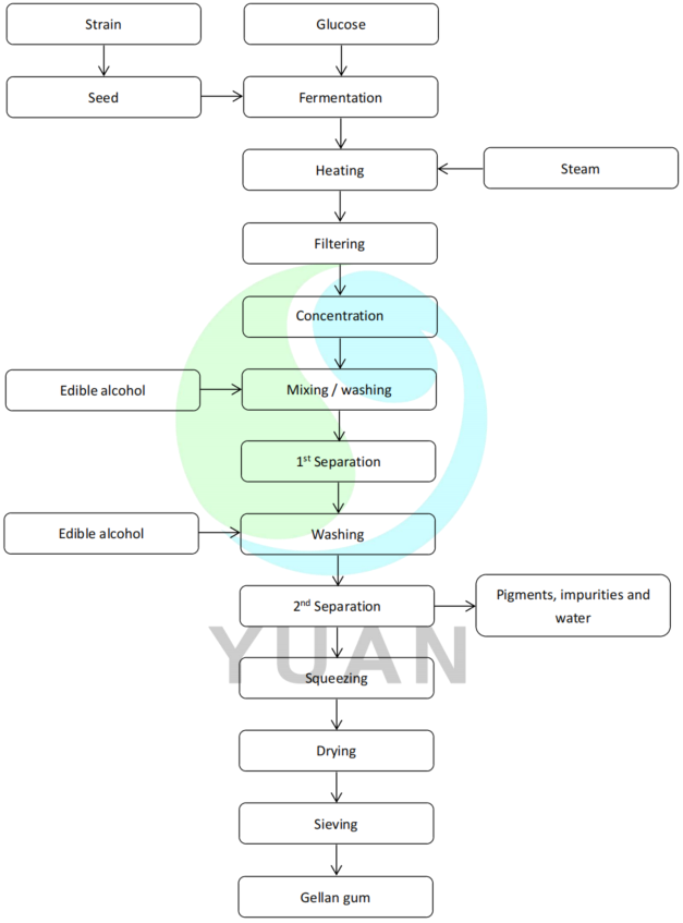 La glucosa calificada ingresa al sistema de fermentación para mantener un cierto tiempo de fermentación para obtener el puré de fermentación calificado. Después del calentamiento, las bacterias en el puré de fermentación se inactivan, luego filtra la proteína de micelio y las partículas insolubles en el puré de fermentación, ingresa al sistema de concentración para la concentración. Se agrega una cierta cantidad de solvente al puré de fermentación concentrado y se agita para que sea completamente mezclado, de modo que la fibra se precipite por completo. Después de la separación y la precipitación, se obtiene el producto. Después del lavado secundario, el tratamiento de separación, prensado y deshidratación, se eliminan parte del pigmento, las impurezas y el agua, y el producto es secado por el secador para obtener el producto calificado de Gellan Gum.
