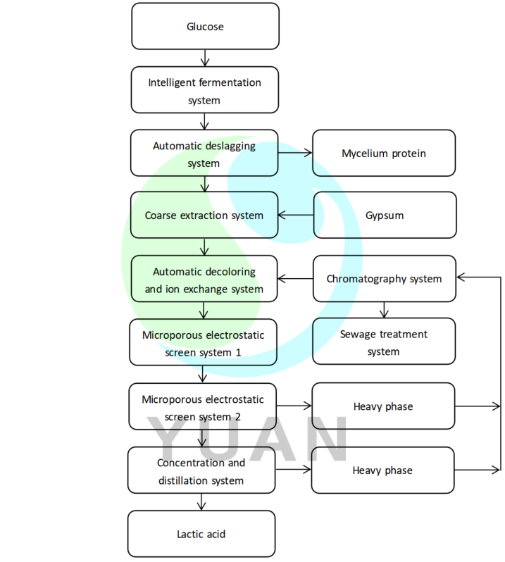 La glucosa calificada después del sistema de lotes y eliminación ingresa al sistema de fermentación para mantener un cierto tiempo de fermentación, luego entra en el sistema de eliminación de filtración para eliminar la proteína gruesa. Después de concentrarse el caldo de fermentación, ingresa al sistema de ácido de lactato de calcio. Después de filtrar CASO4, pasa por el sistema de aislamiento continuo para la decoloración, la desodorización y la desalación. Después de refinar, ingresa al sistema de filtración de membrana, el sistema de concentración y purificación para obtener el producto calificado de ácido L-láctico.